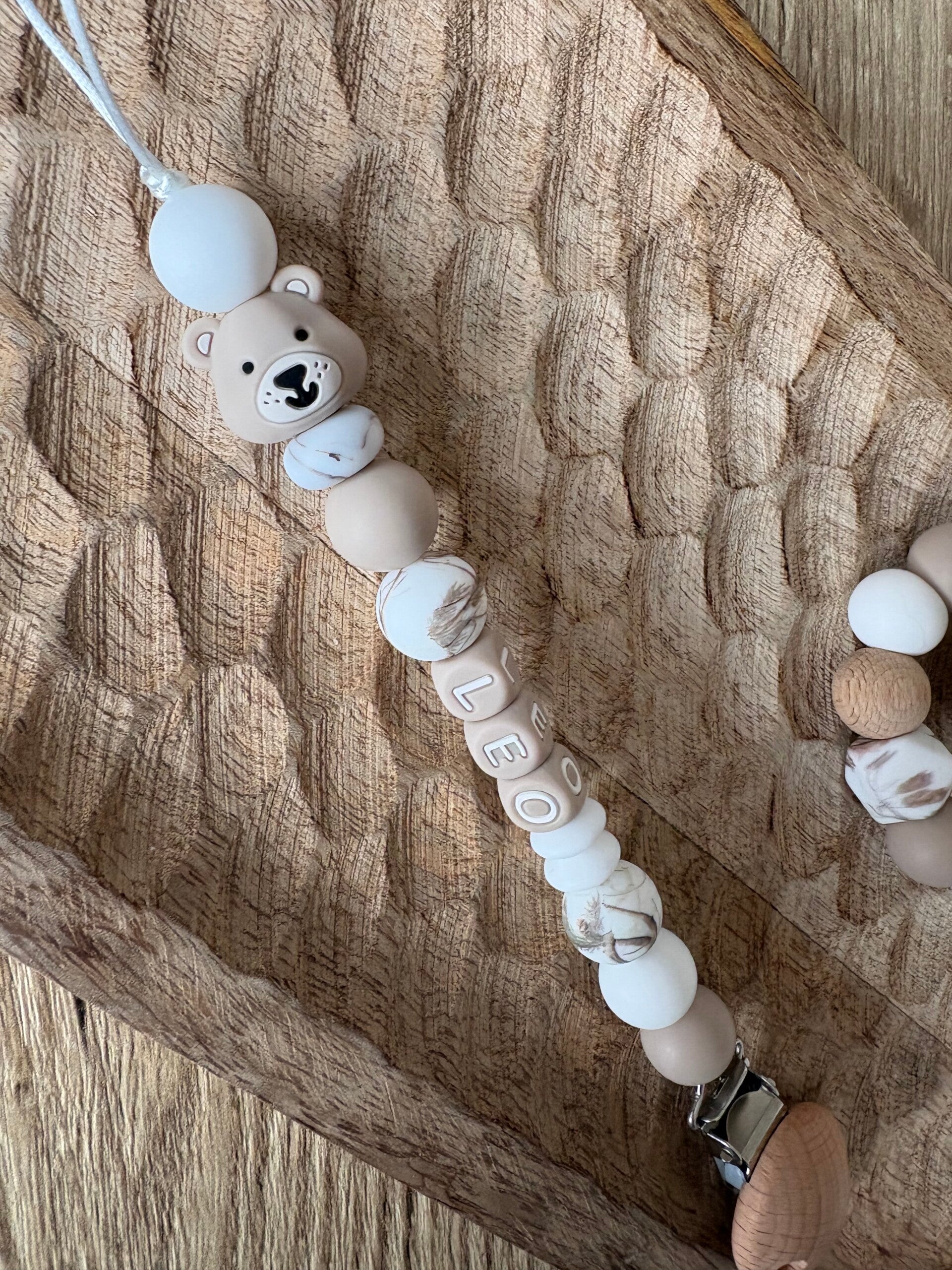 Ontmoet 'Leo', het schattige beertje dat over het speentje van jouw kleintje waakt. Dit handgemaakte speenkoord combineert warme aardetinten met een stoer accent, perfect voor elke outfit.