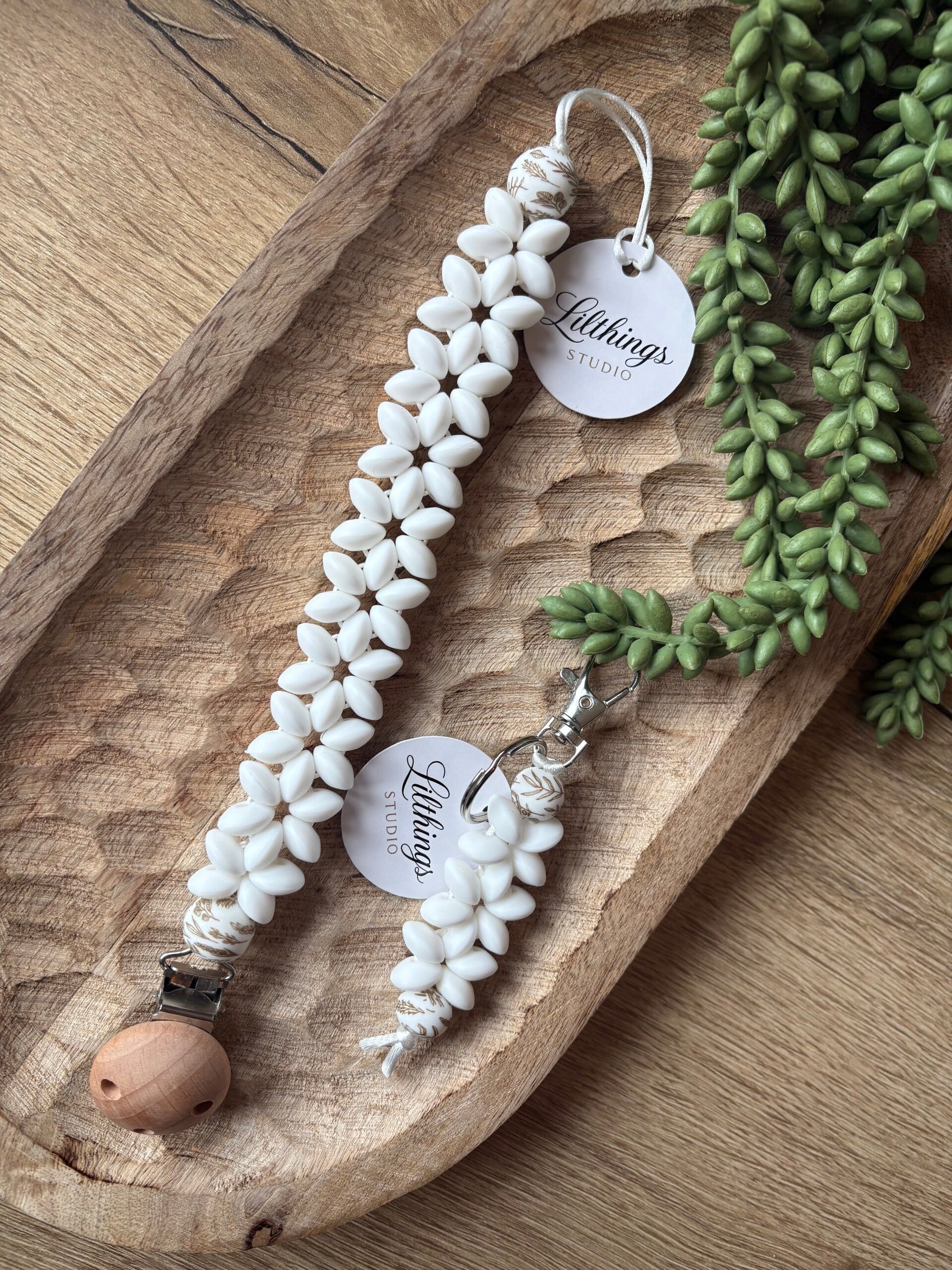 Wil je extra uitpakken? Bestel dan de bijpassende witte bloemen sleutelhanger mee! Deze matcht perfect bij het speenkoord en is een stijlvol accessoire voor aan je eigen sleutelbos, de luiertas of de tas van je kindje.
